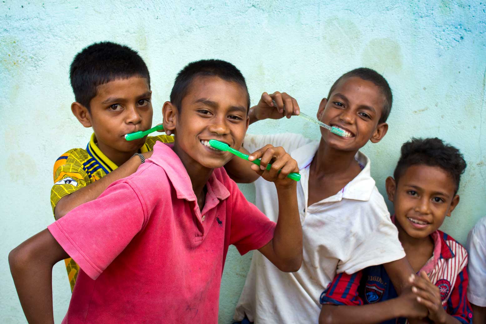 - After a quick class in how to use their first tooth brush these happy lads demonstrate what they learned.