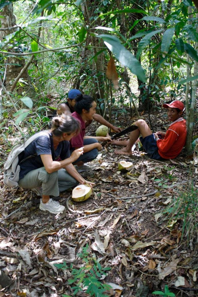 It seems that on Nila everything is up the mountain and the best bamboo is found halfway up the mountain just beside the best canoe building trees. It took us about an hour of climbing to reach the sheltered grove of Nutmeg and clove trees where the paths divide into one that crosses the island and the other that goes to the hot volcanic springs. It was along the path to the springs we were assured the best bamboo would be found. Another 20 minutes walking with a visit to where a large new canoe was being carved from a fallen tree trunk brought us to the bamboo forests of Nila. Most think of Bamboo as a modest decorative plant found around hotels and in gardens. This was the real full-grown wild bamboo reaching over 20 meters high and well over 20 cm in diameter in some places. It took us some time to pick a proper “stick” with the needed 15 cm diameter in the middle as well as a good straight run for at least 12 meters. At last one was decided on, cut, and trimmed. That was the easy part. Next came the task of getting it down from the mountain and out of the forest. What started out as a combined effort was soon taken over by the two local lads who simply shouldered the thing and took off running down the path.