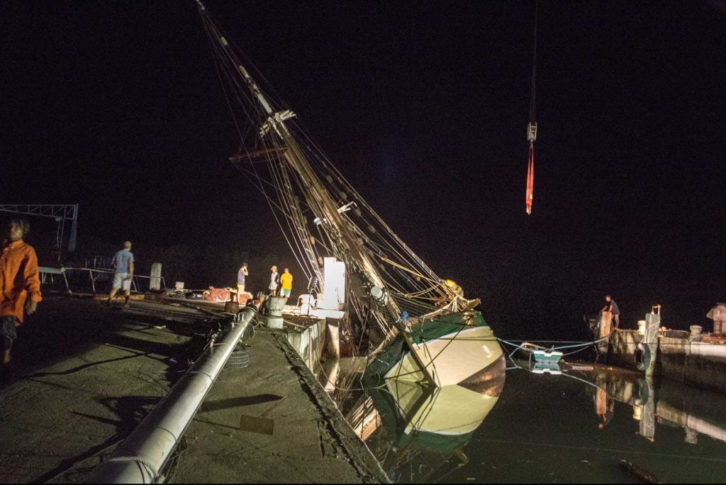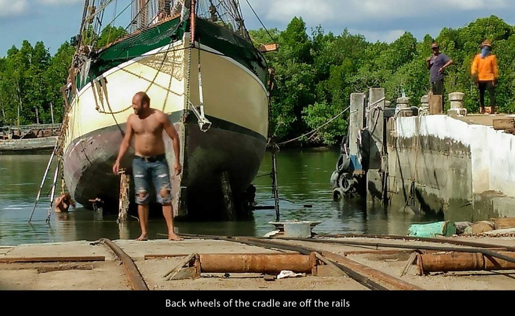 - 8 February 2019, Historic vessel Vega approaches the haul-out bay at PSS shipyard on the Chebilang River at precisely the date and time specified by the boatyard. This was Vega’s third visit there.