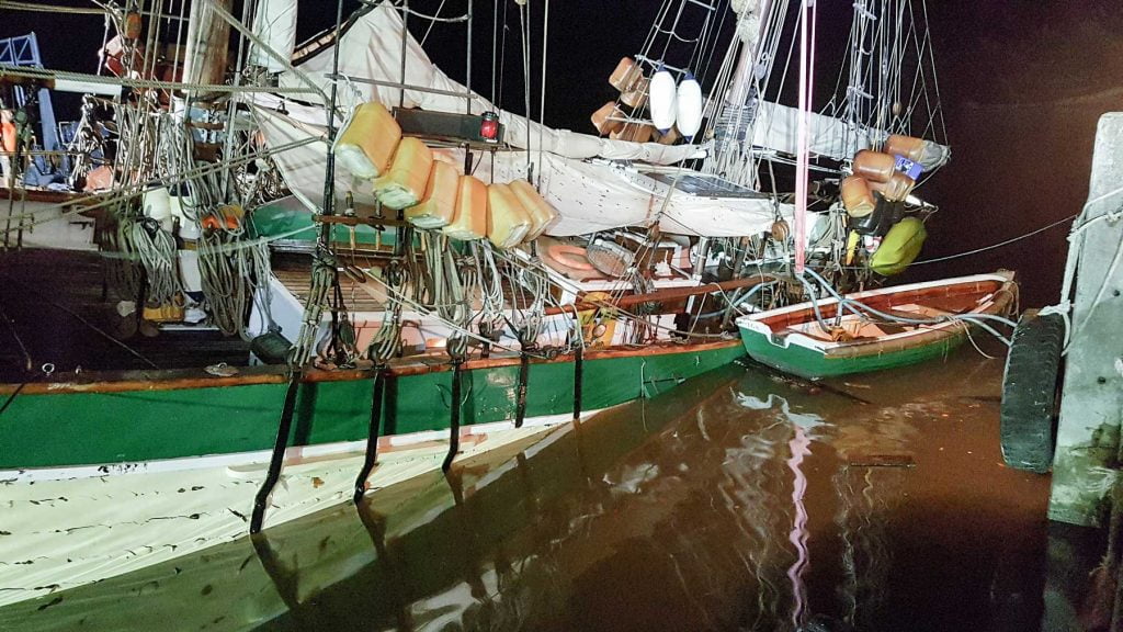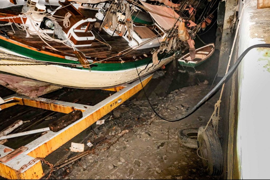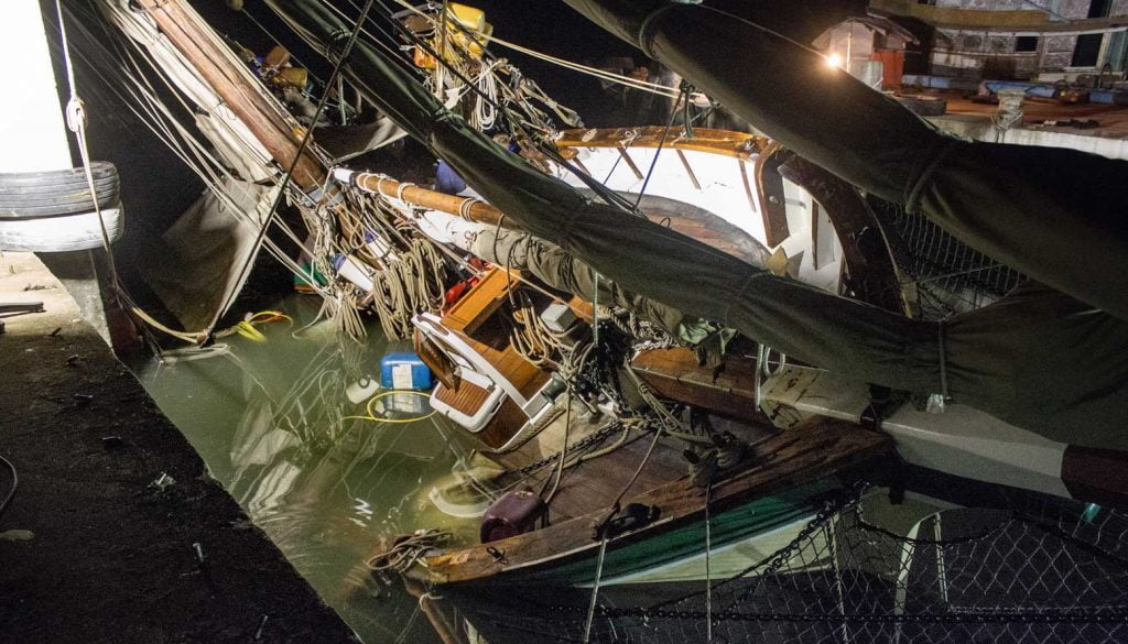 - Vega’s three onboard bilge pumps were unable to control water flooding in on the portside from spring caulking seams and where the hull hit the edge of the trolley.