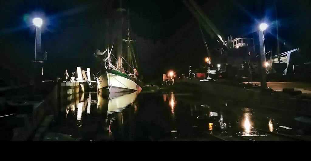 - At about midnight the crane returned Vega to an upright position. The pumps rapidly began lowering the internal water level. We asked the Shipyard to block the boat in that position with the crane still attached for safety and wait for the next low tide to patch the leaks. They ignored our request.