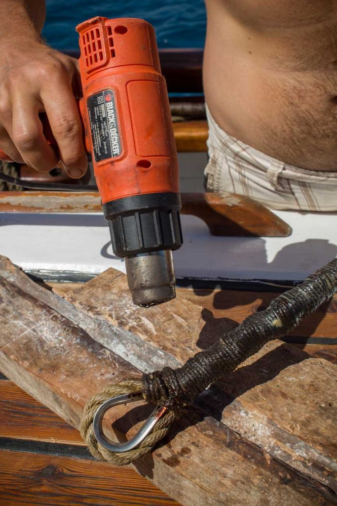 - a touch of the heat gun swiftly seals the servings around the splice. If you want to be fancy a small turkshead knot goes nicely just behind the thimble.