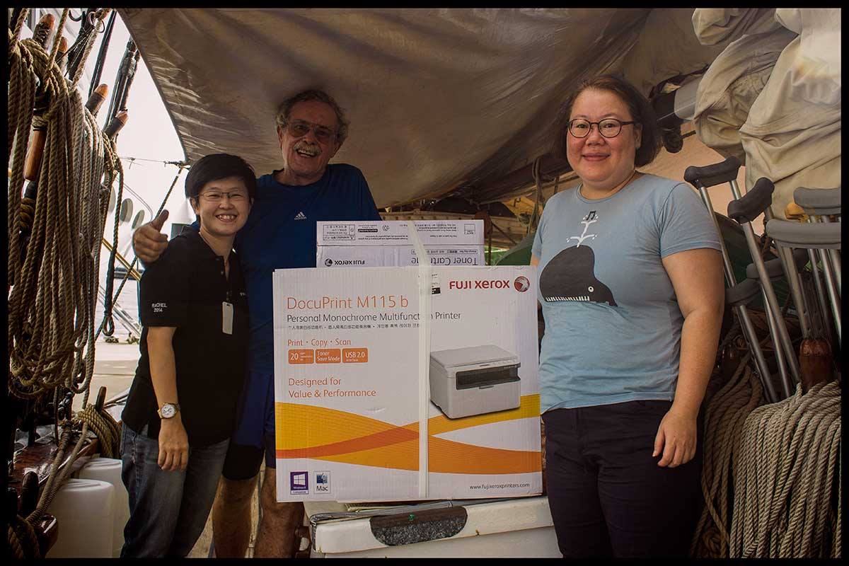 June and Rachel from Pamarine deliver a new heavy-duty printer for the island of Medang. We also want to thank the company for our new liferaft and other safety equipment.